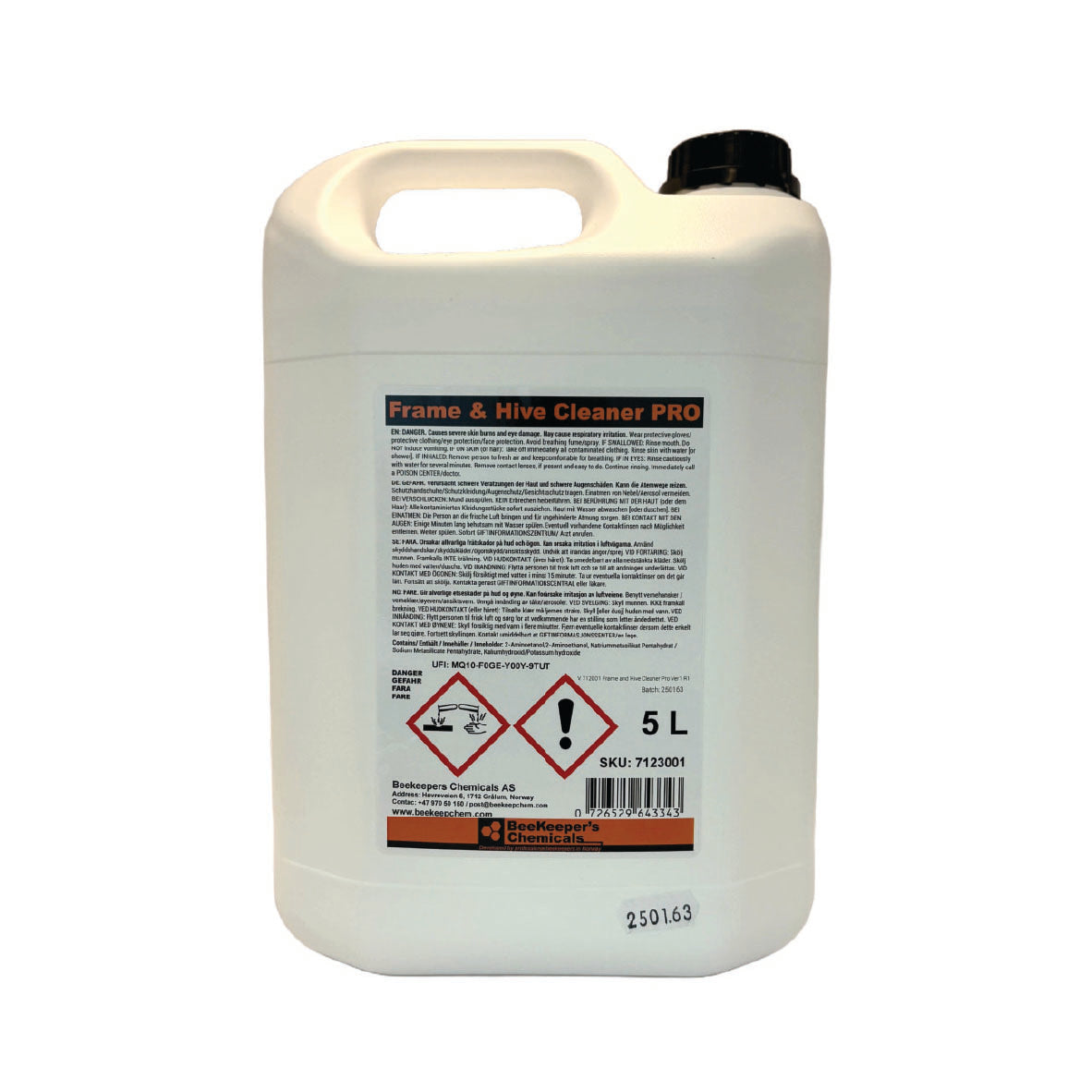The recommended dilution ratio is 1:9 – one part cleaner to nine parts water. Frame & Hive Cleaner PRO is supplied in durable 5-litre HDPE jerrycans with child-resistant caps and clear labeling. When stored unopened in a cool, dry place, the product has a shelf life of up to 24 months.
